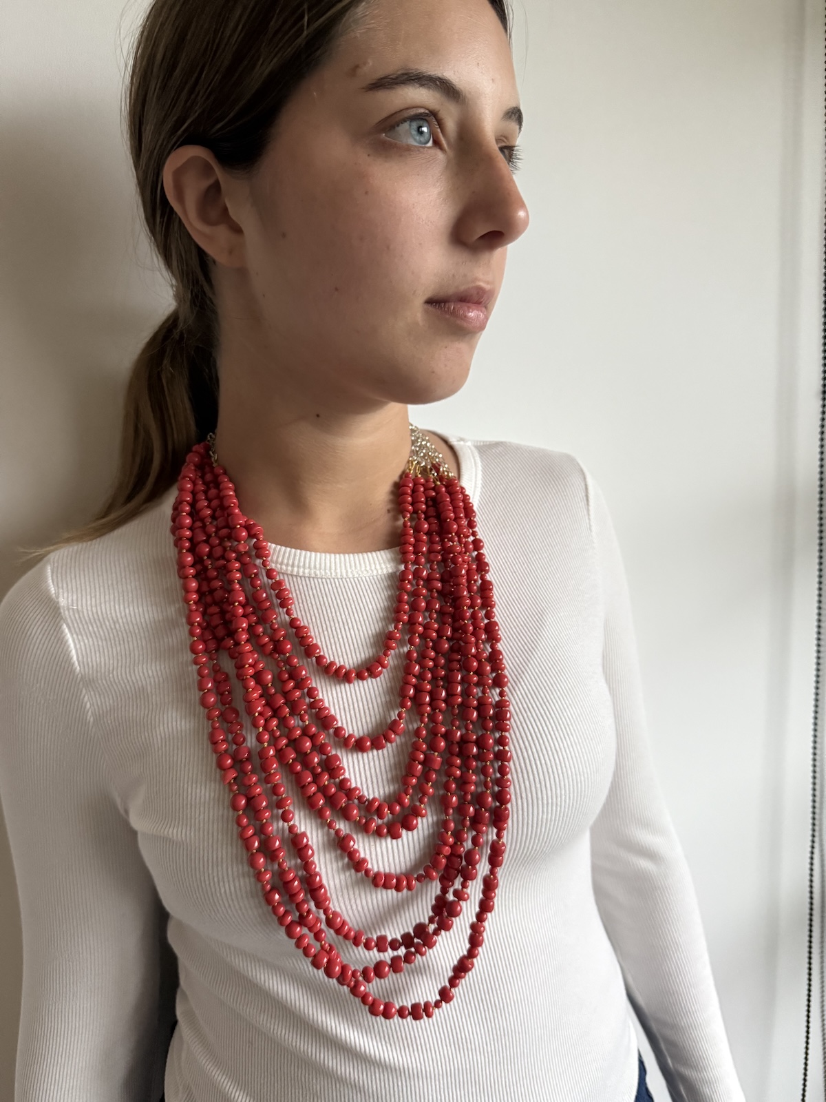 Collar a media altura de resina coral pasadas por hilo dorado con 8 cuentas en distintos niveles , combinadasa con cadena plateada