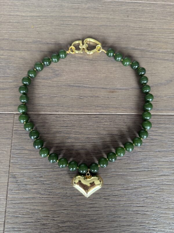 Collar corto de una vuelta de piedras en tono verde . Dije en forma de corazon brillante dorado.