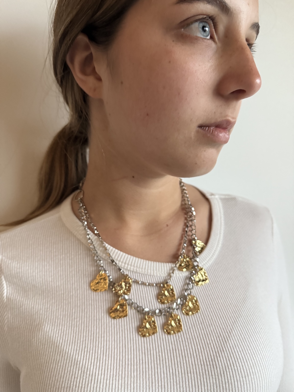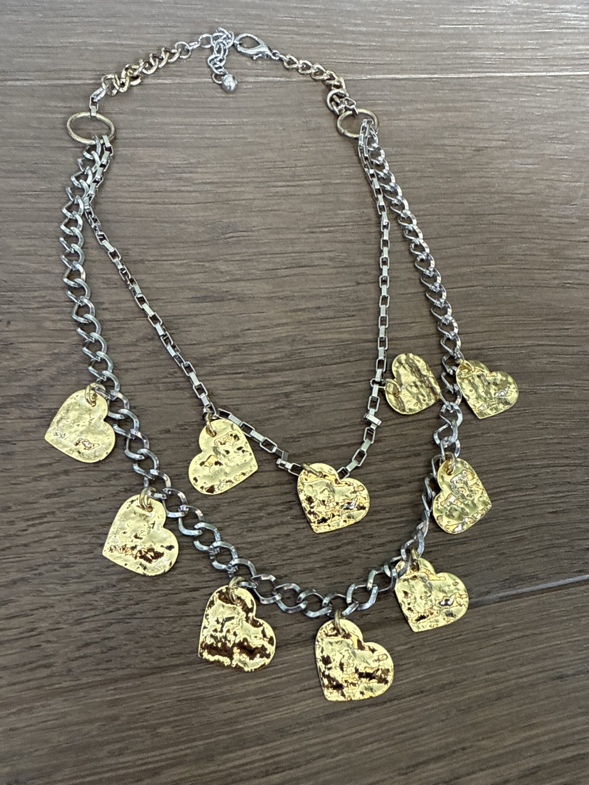 Collar corto de dos caidas de cadenas plateadas. Cada cadena tiene dijes de corazon dorado en acabado martillado.
