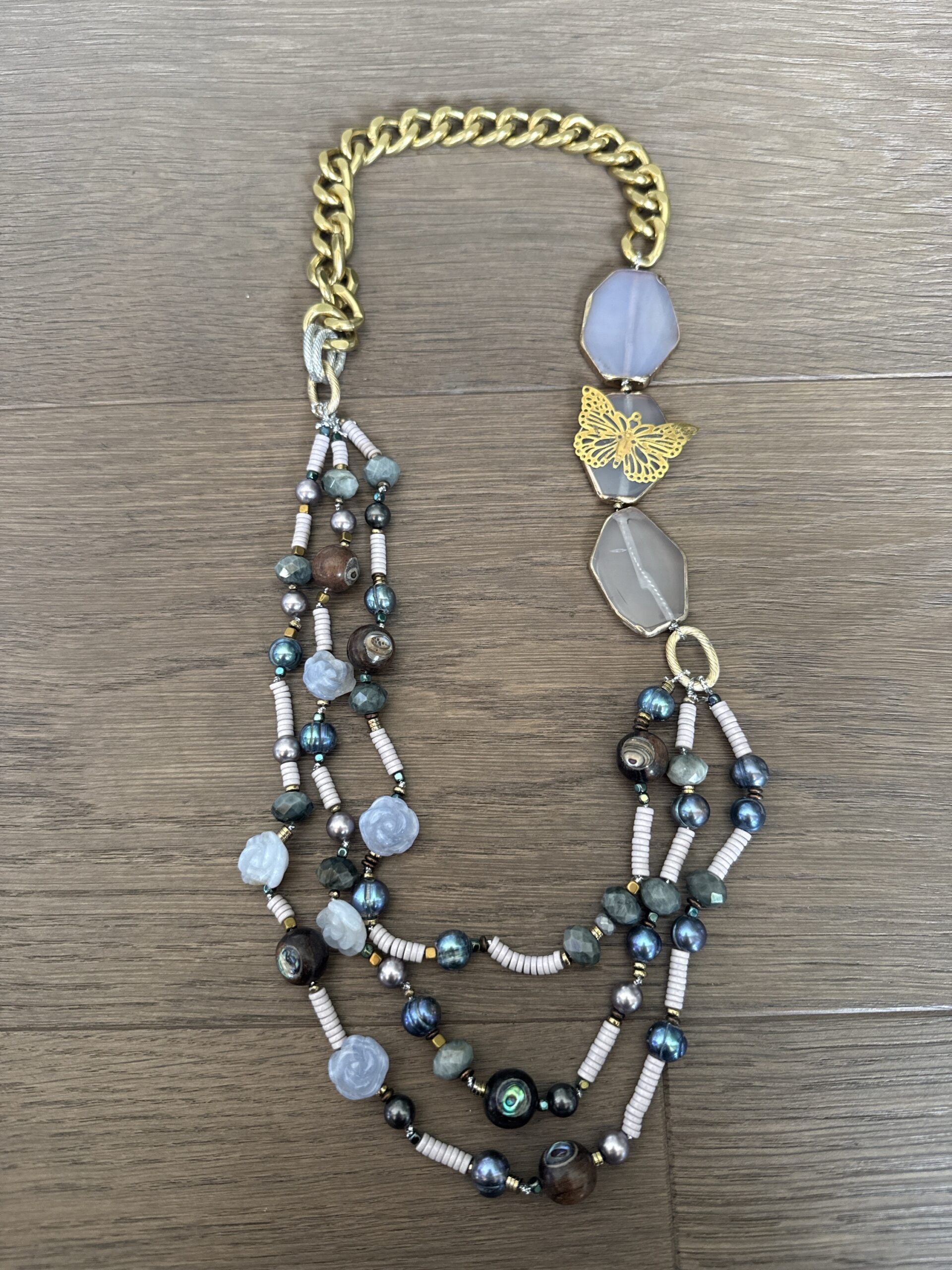 Collar Best Seller con 3 caidas de cuentas combinando perlas de rio gris , resina en tonos lila y flores de piedra celeste.Detalle de cristal opaco y detalle de filigrana dorada en forma de mariposa . Cadena dorada opaca al cuello