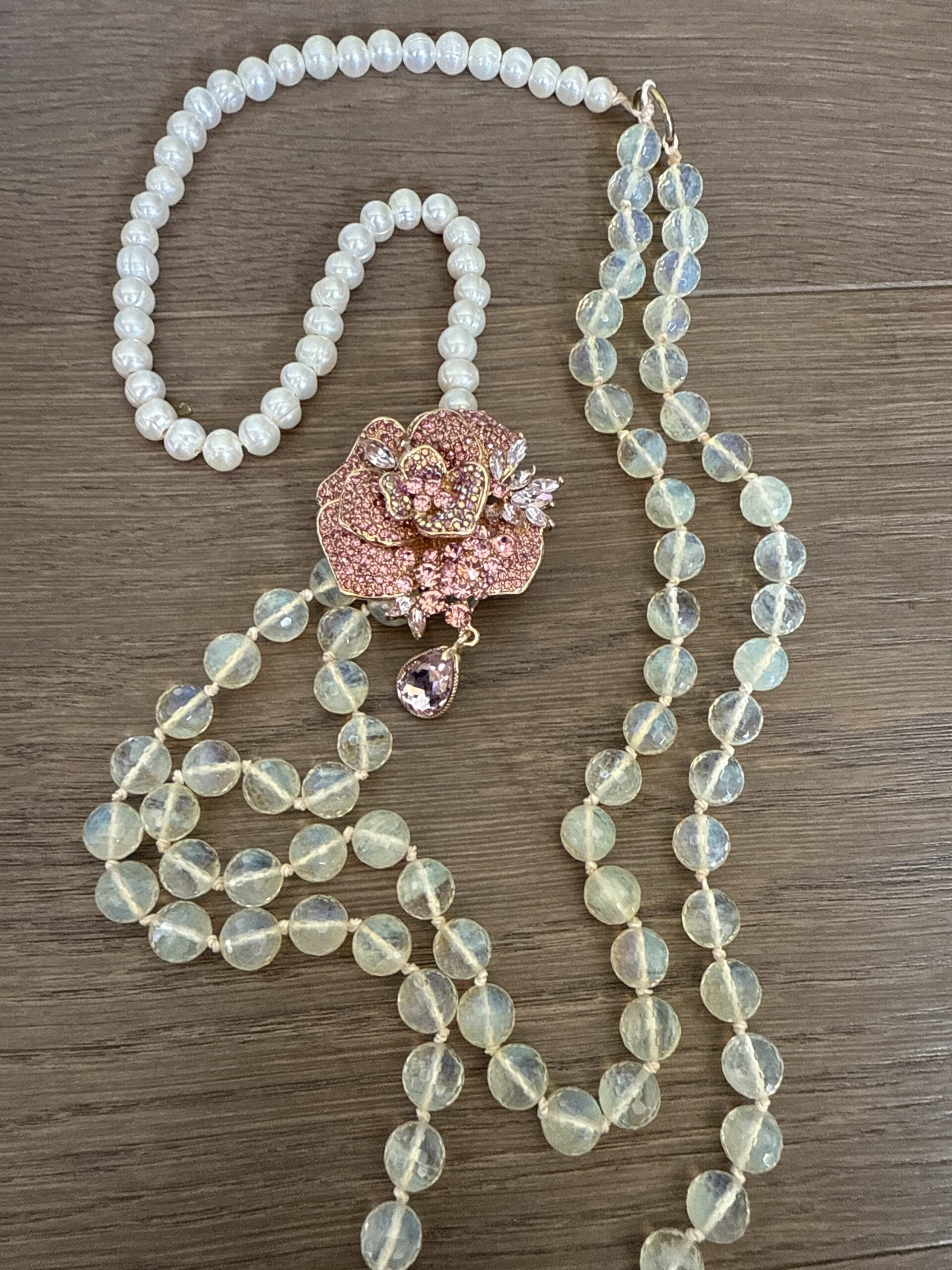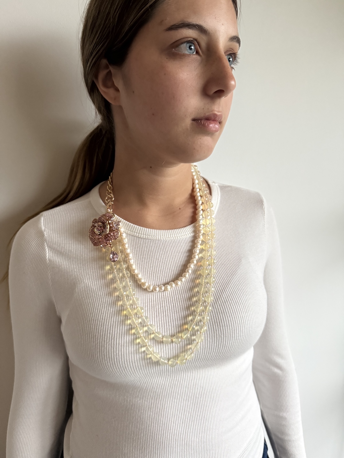 Collar Best seller. Gama sutil de cristales amarillo chmapagne , perlas de rio y dije de flor en tonos oro rojo y circonio rosados.