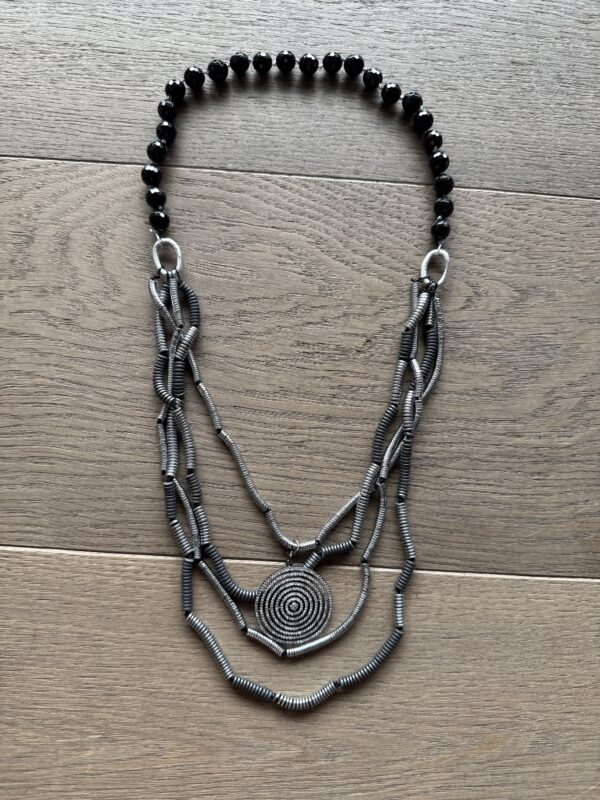 Collar Best Seller de cuatro caidas en diferentes alturas de discos de acerina y discos plateados. Dije en espiral de circonios. Sobre el cuello una sarta de cristales negros.