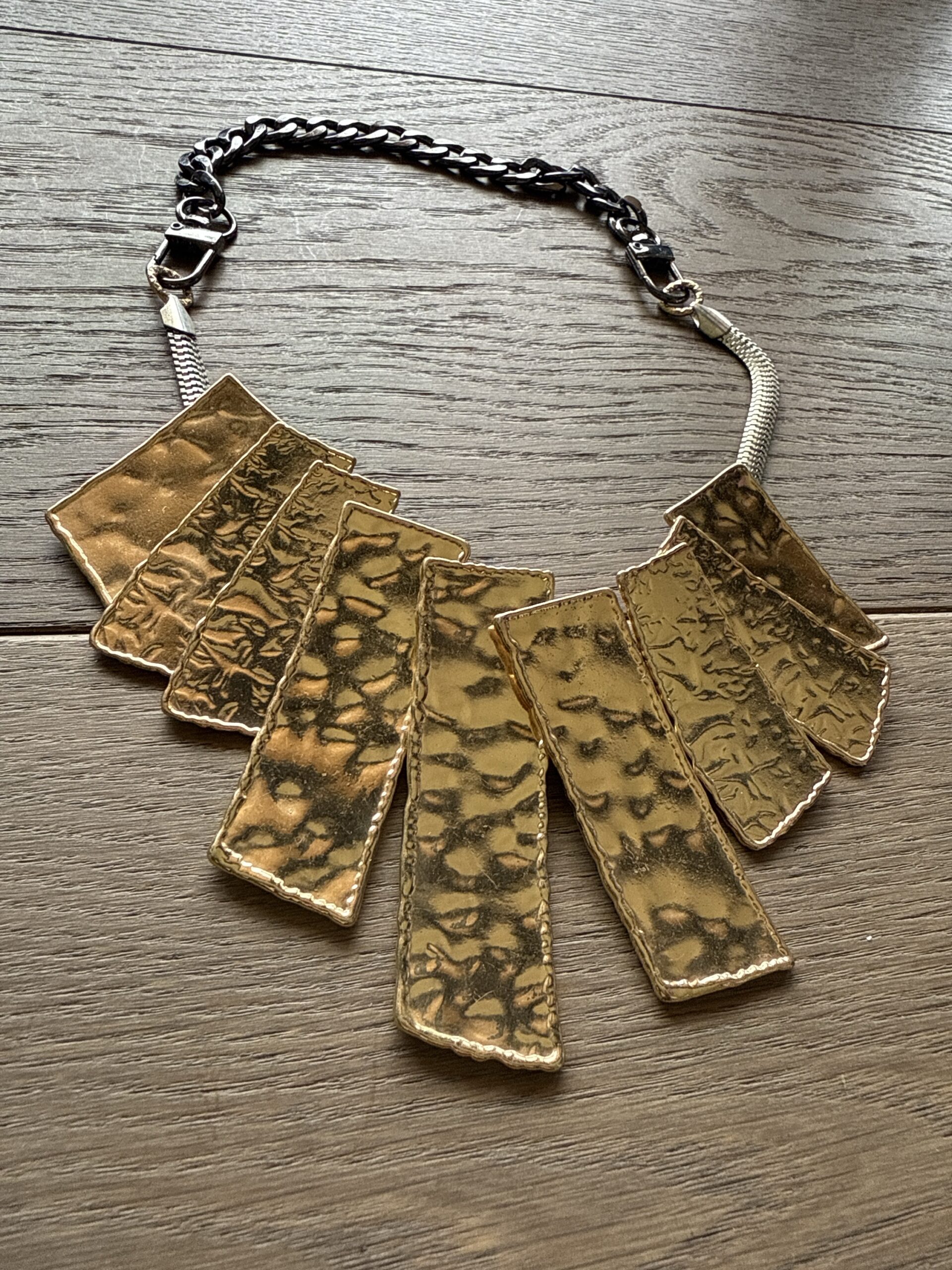 Collar corto . Combinacion de dorados , plateados y acerina. Detalle de laminas martilladas de diferentes tamaños en el centro del collar.