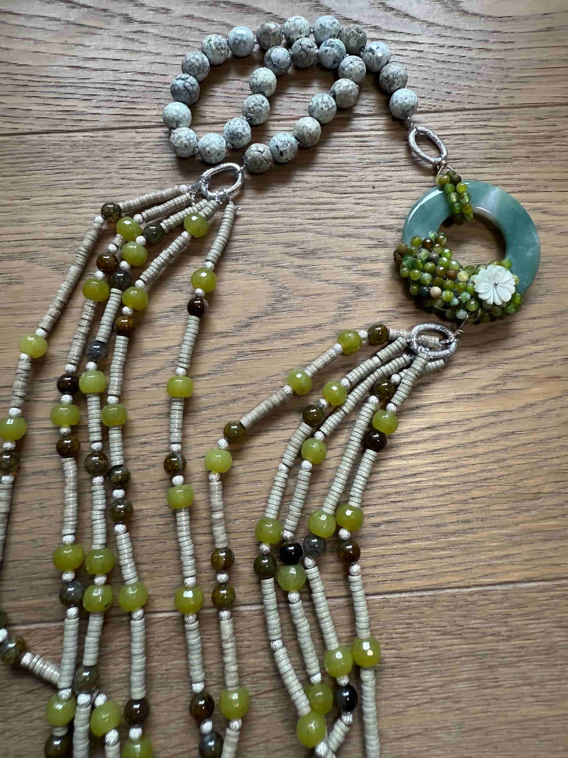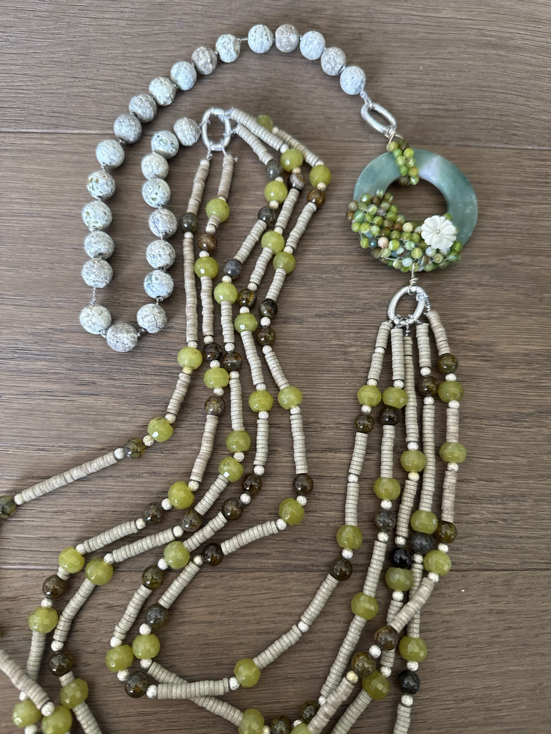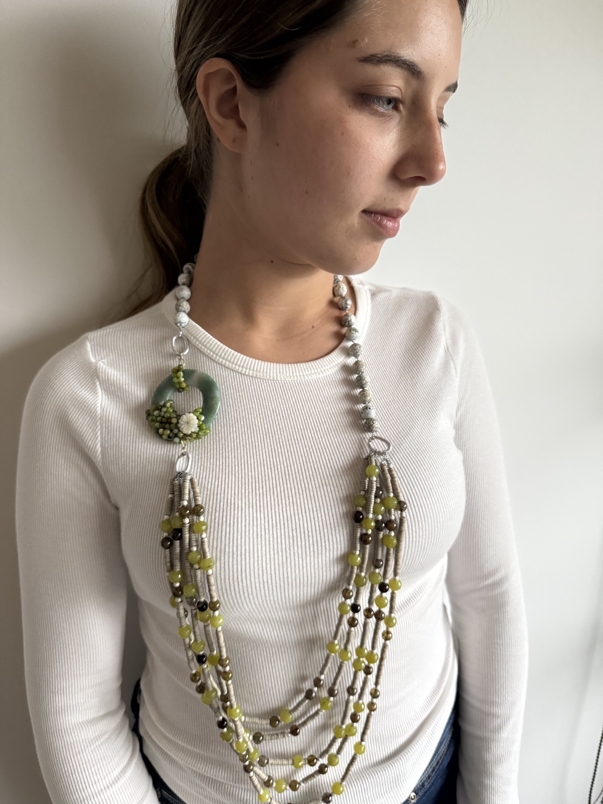 Collar Best seller elaborado con diferentes materiales. Cinco caidas combianndo agatha , cristales y resina en tonos olivo y verde petroleo. Al cuello piedras volcanicas tonos blanco/verde. Detalle de dije elaborado por un disco de agatha verde , trabajado con detalles en nacar y criustales verdes.