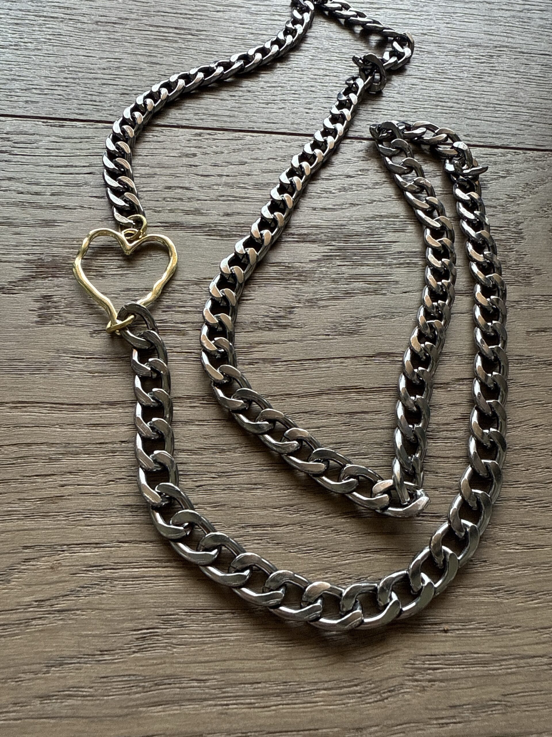 Collar largo . Cadena de acerina y detalle de dije de corazon hueco dorado.