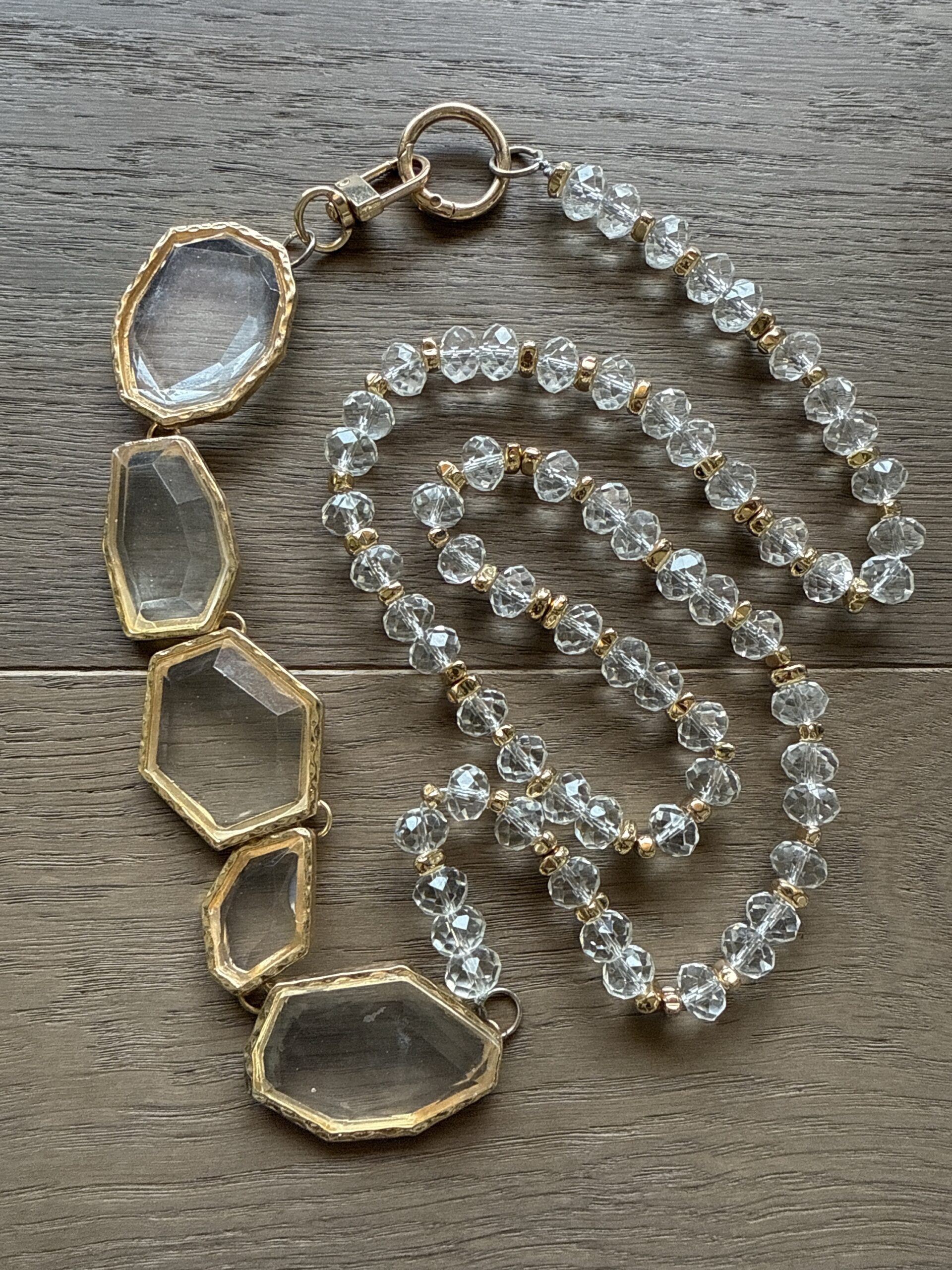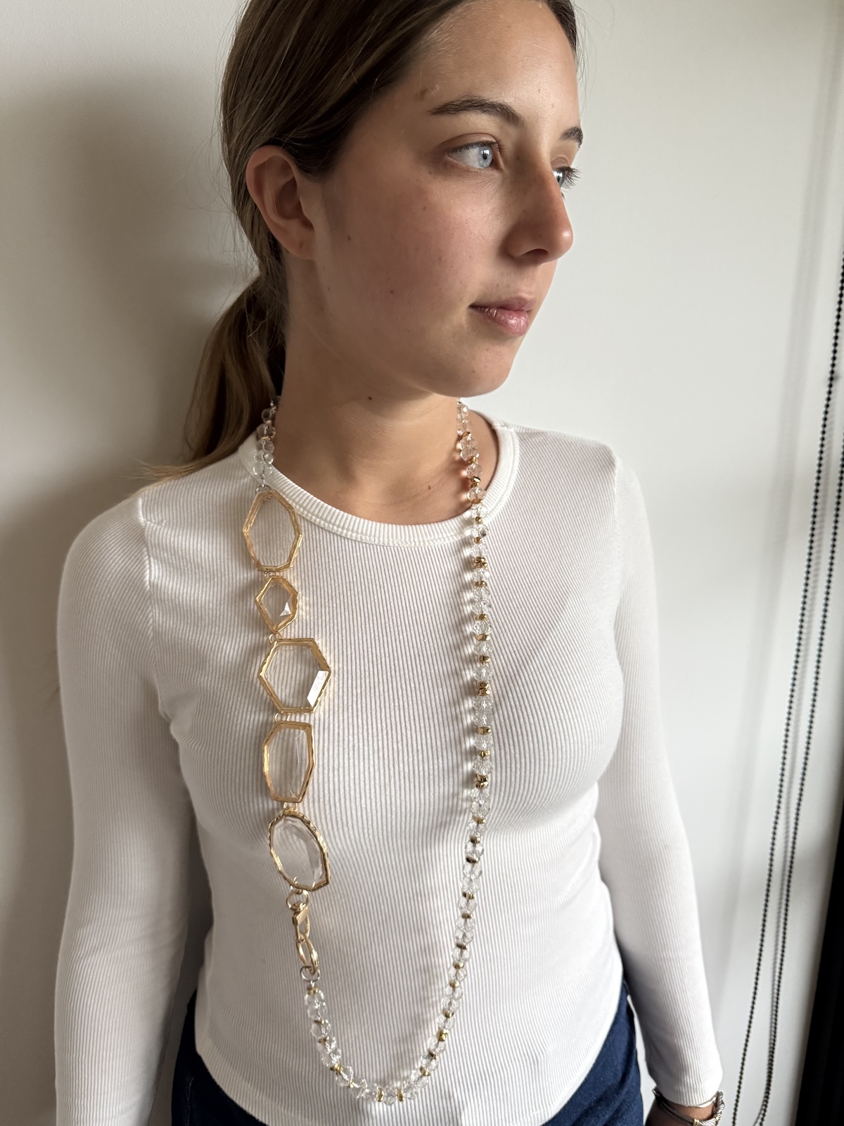 Collar largo de cristales trasnparentes de diferentes tamaños pasados por hilo dorado. Detalle de resinas simulando cristal transparenetes engastados en dorado.