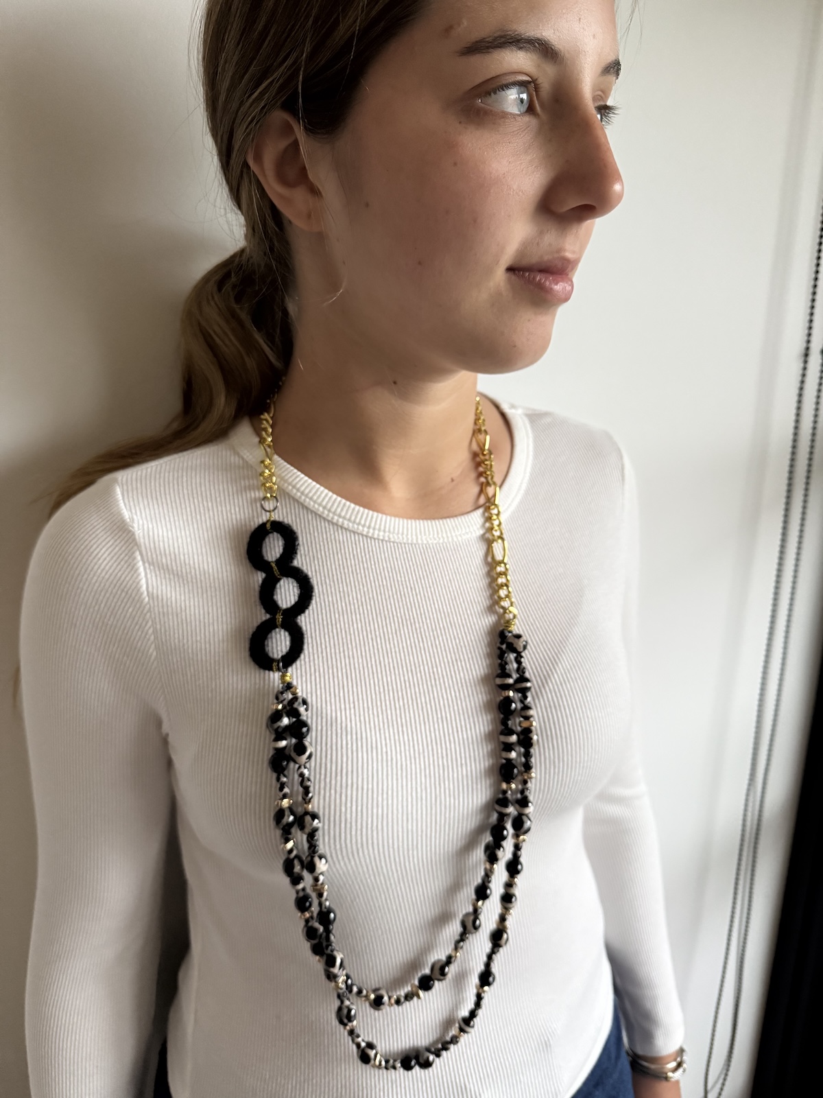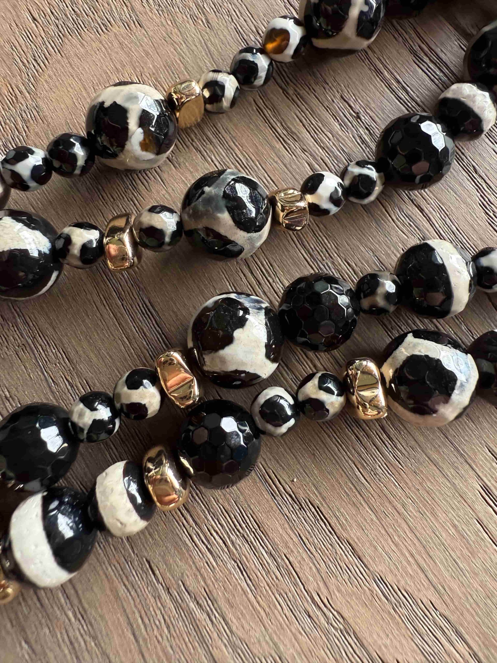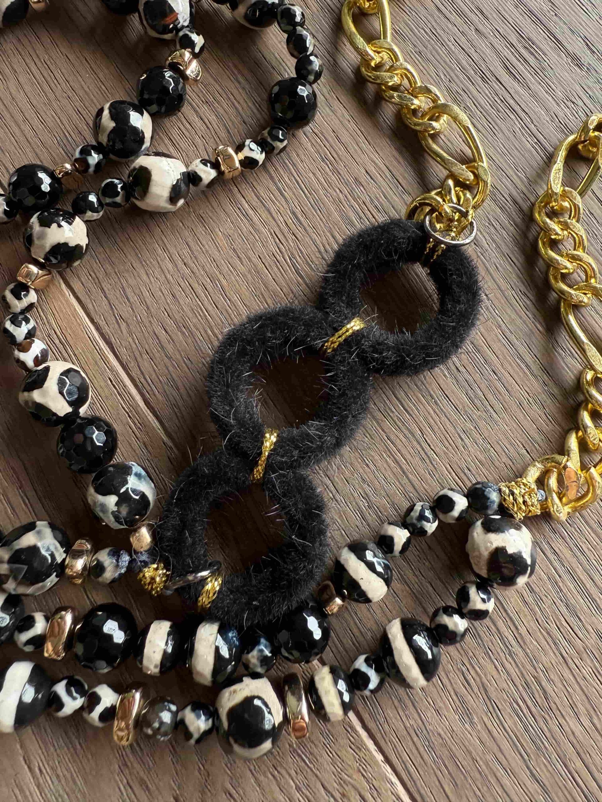 Collar Best Seller compuesto por dos sartas que caen en diferenetes alturas. Cada sarta combina cristales diseńo zebra (blanco y negro) de direfentes diametros y detalles dorados . Cadena dorada grueso al cuello . Detalle de lado de Rondelas negras hechas con tela de pelusa.