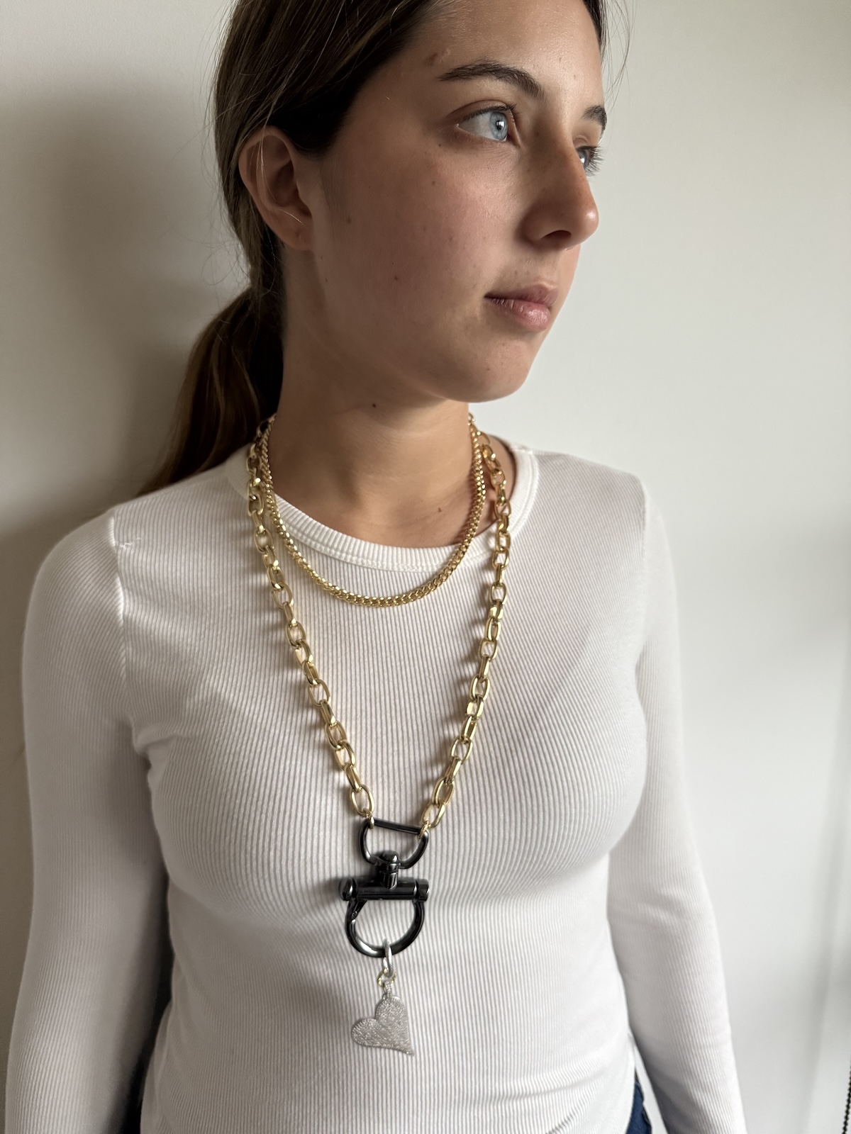 Collar de doble cadena dorada , cada cadena diseñada con eslabones diferentees . Broche XL en tono acerina . Dije de corazon plateado de circonios plateados.