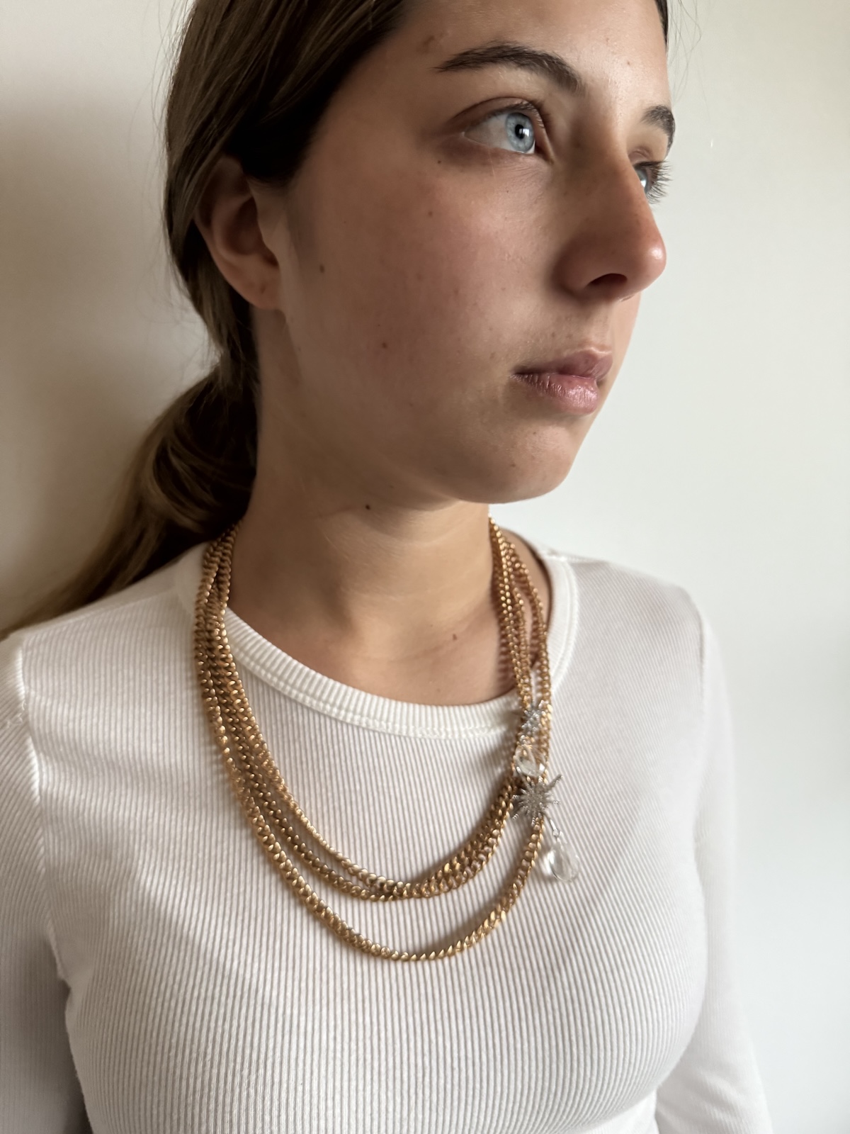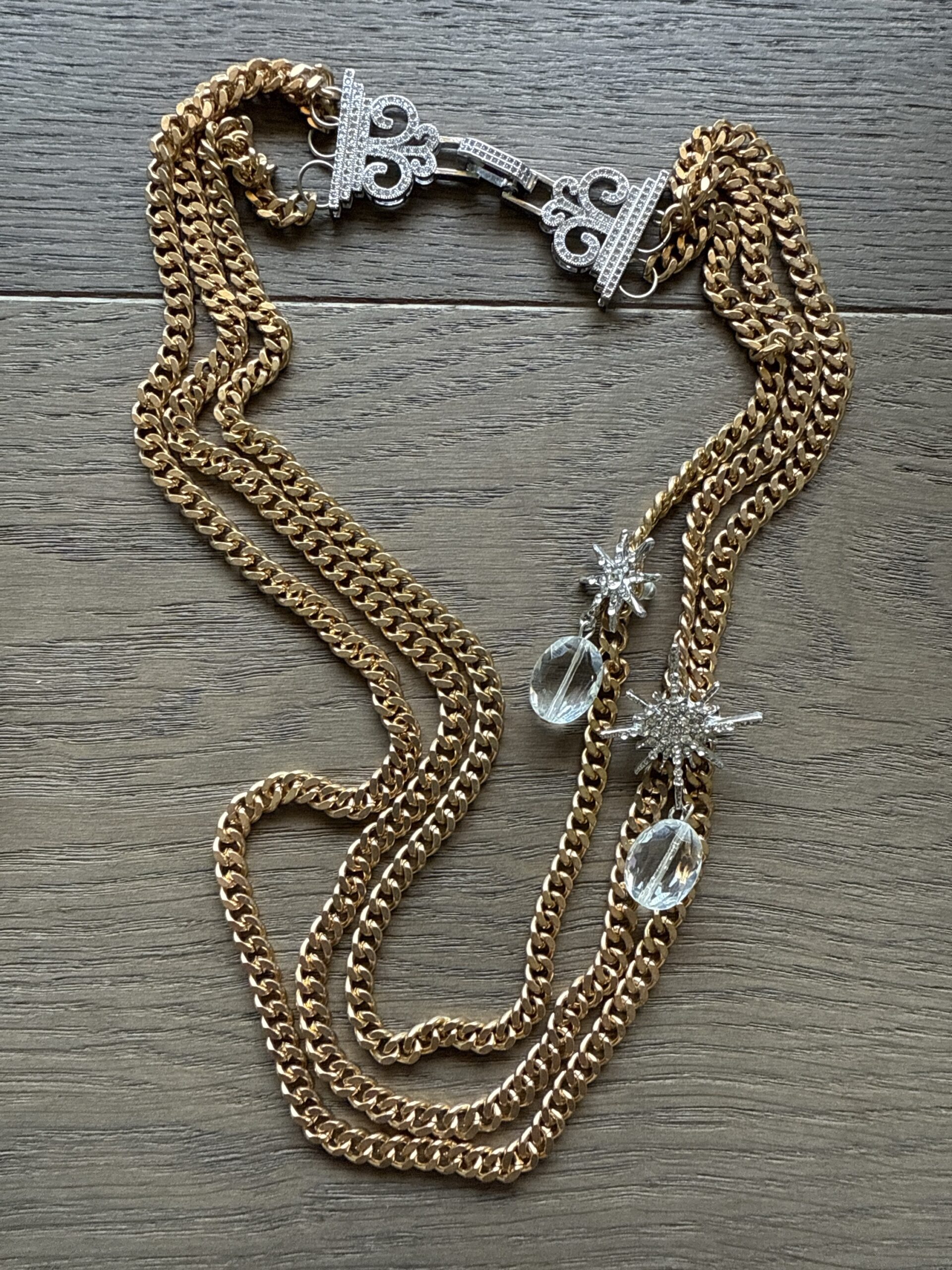 Collar corto de tres caidas de cadena dorada . Broche sofisticado plateado con circonios.Detalles de estrellas y cristales transparentes.