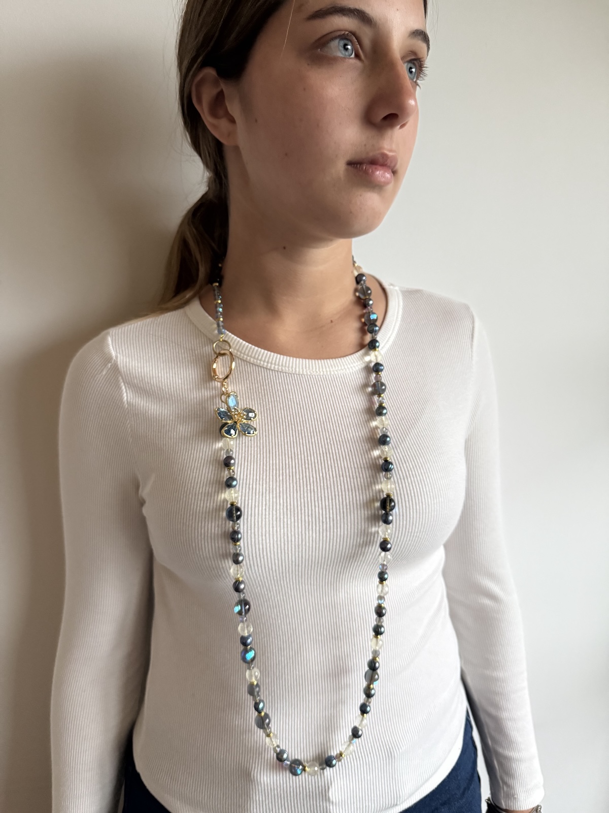 Collar largo combinando cristales en diferentes tonos azules y transparentes y perlas de rio tornasoladas grisaseas/azuladas. Detalle de dijo de flor de cristal celeste y circonios. Broche circular dorado.