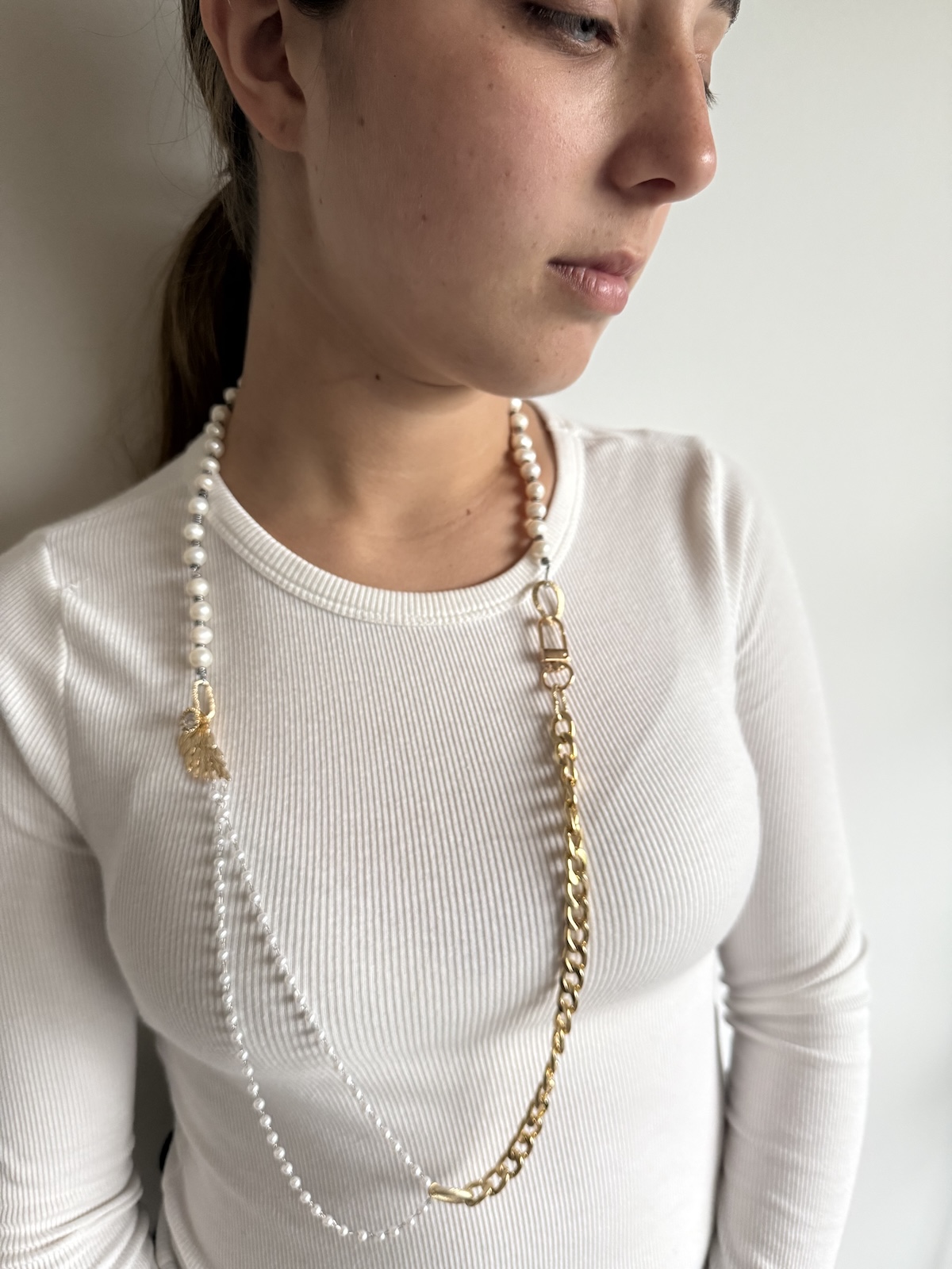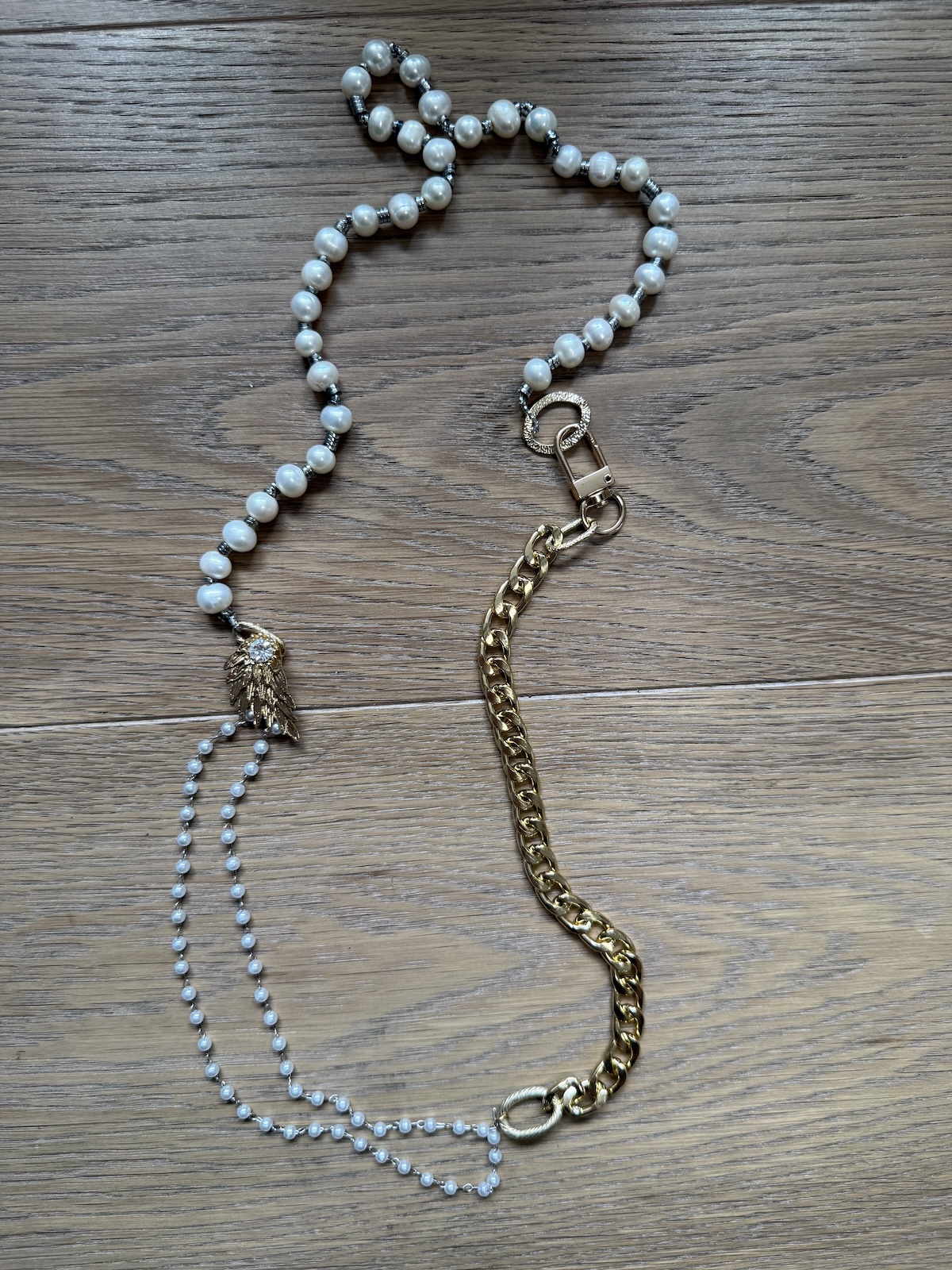 Collar largo de perlas , cadena de eslabones grandes dorada y dije dorado de ala de angel con circonios.