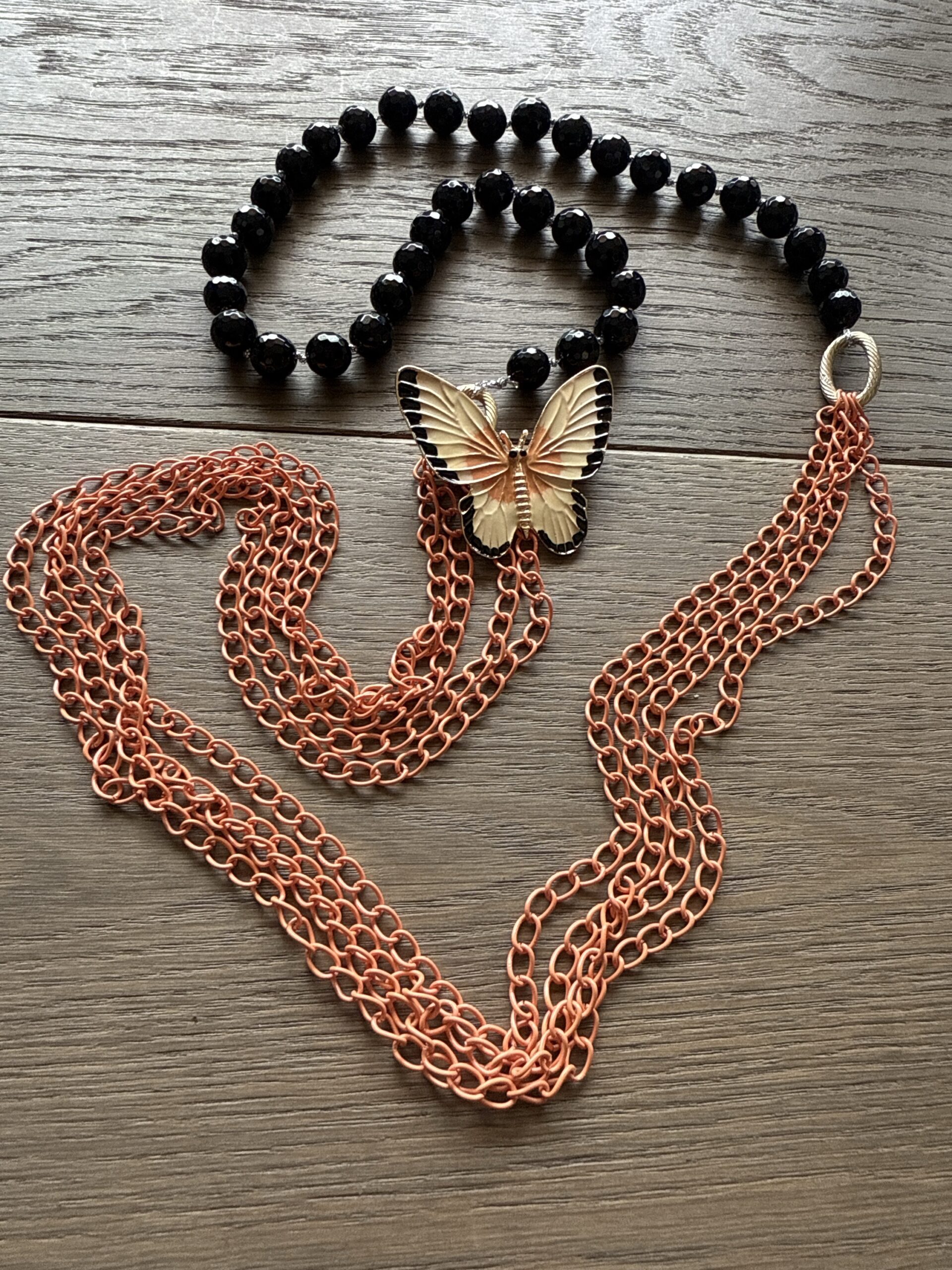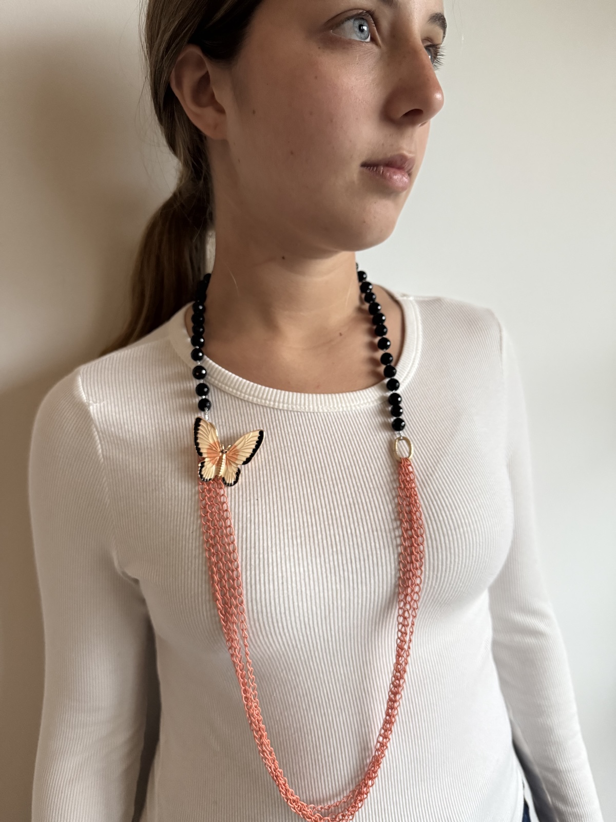 Collar Best Seller. Caida de cuatro cadenas salmon en diferenetes alturas. detalle de mariposas esmaltada en tonos salmon , beige y negro. Al cuello cuenta de cristales negro pasados por hilo plateado..