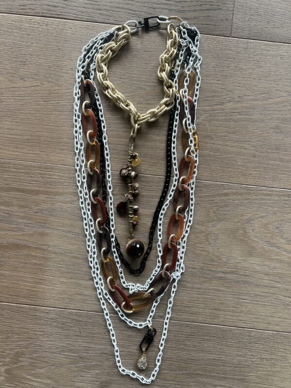 Collar con caida de cadenas en diferentes alturas blancas ,negras de acrilico color carmelo , doradas y detalle elaborado en cordon con diferentes charms y cristales.