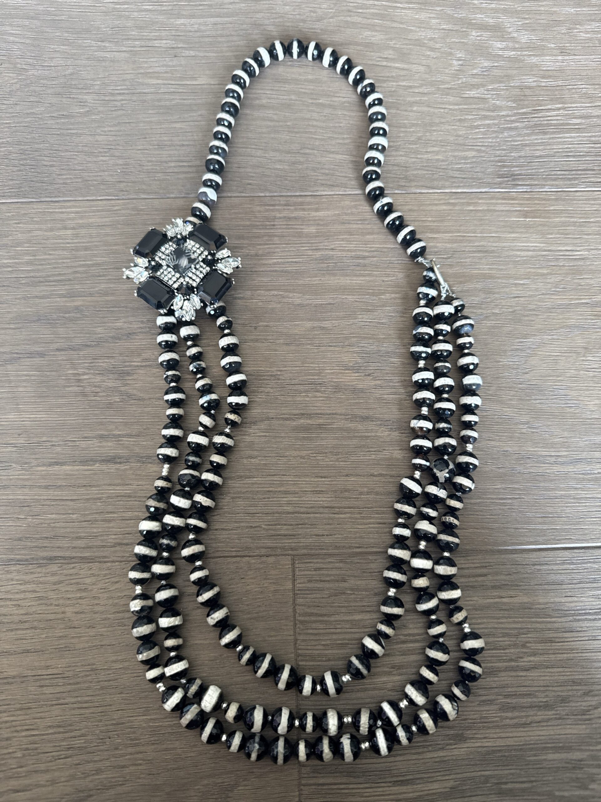 Collar Best seller. Tres caidas de cristales diseño zebra en blanco y negro. Dije llamativo hecho con cristales y circonios en tonos plata y negro. Se puede usar con y sin dije. Cristales pasados por hilo plateado.