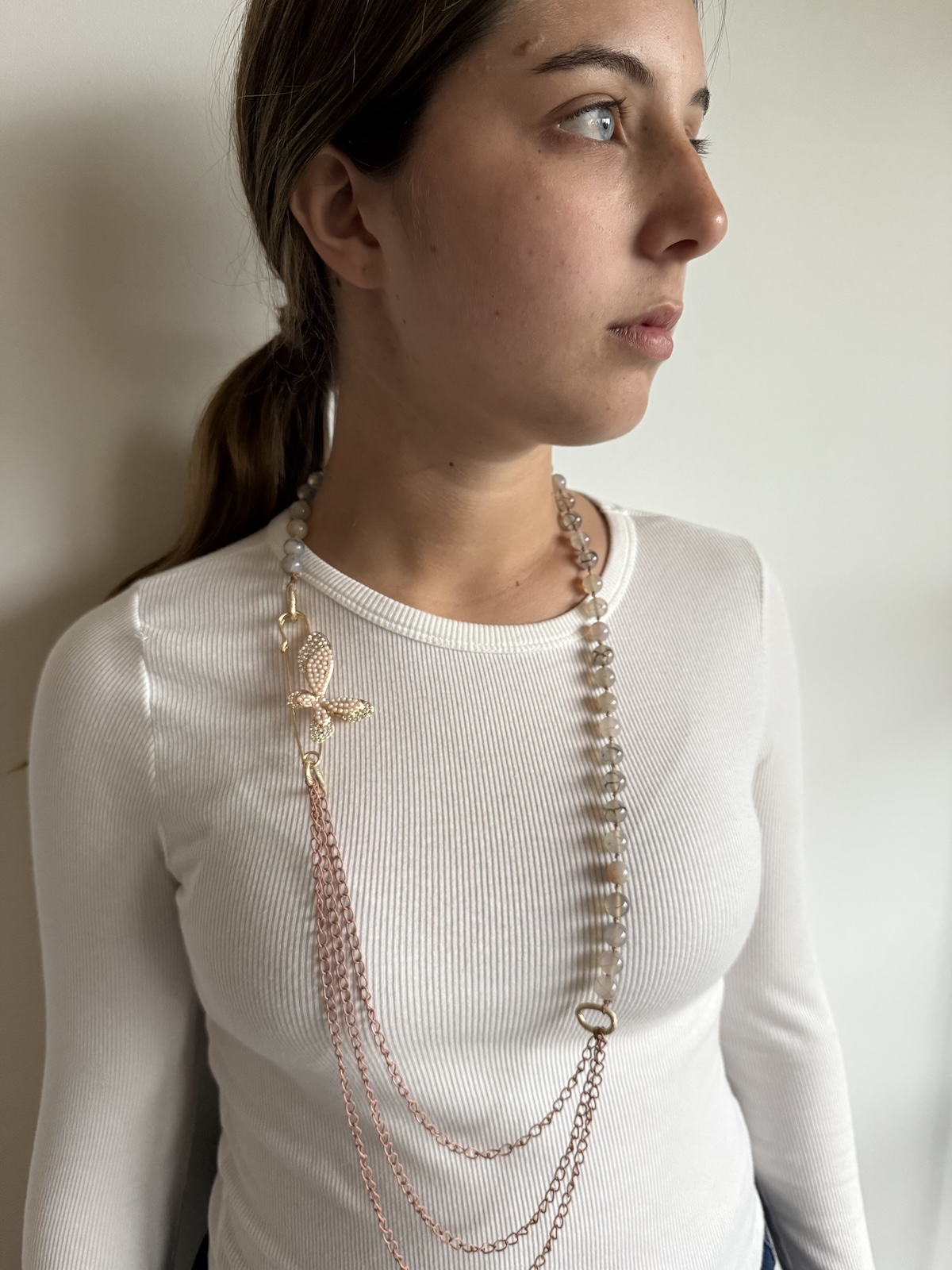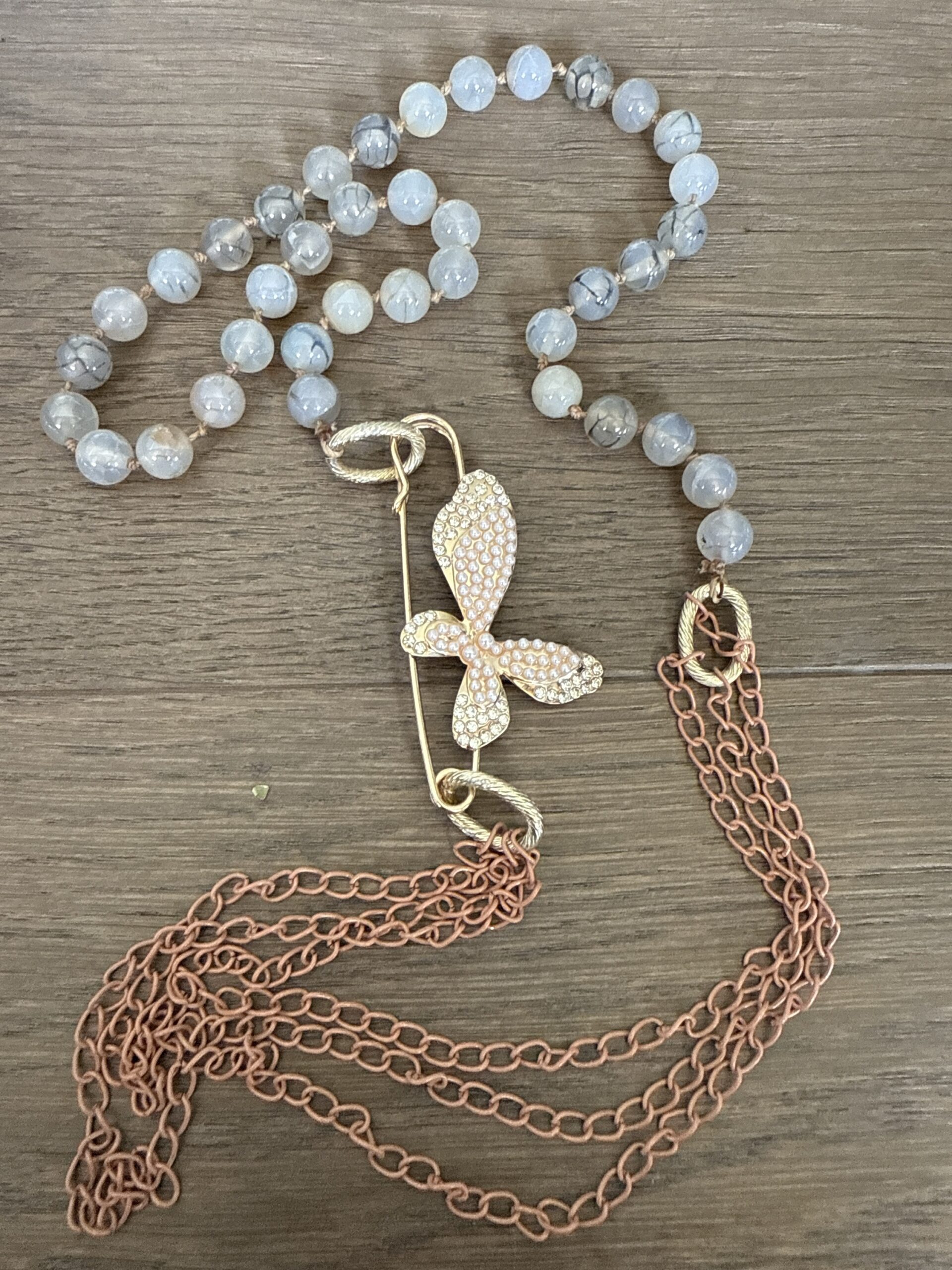 Collar de agathas jaspeadas grises, caida en diferentes caidas de tres cadenas color salmon . Detalle de imperdible intervenido con un mariposa de circones y perlas.