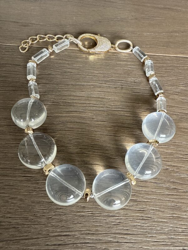 Collar corto de cuarzos transparentes grandes redondos y cilindricos , pasados por hilo y separadadores dorados. Broche importante dorado con circonios.