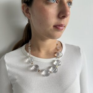Collar a media altura. Combina perlas pasadas por hilo dorado , cristales en forma de cascajos y cadena dorada gruesa. Broche dorado con circonios.