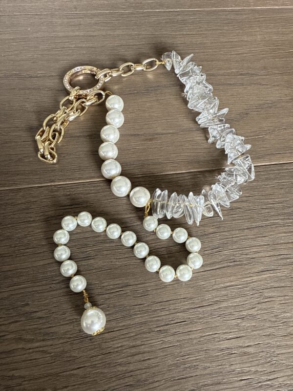 Collar a media altura. Combina perlas pasadas por hilo dorado , cristales en forma de cascajos y cadena dorada gruesa. Broche dorado con circonios.
