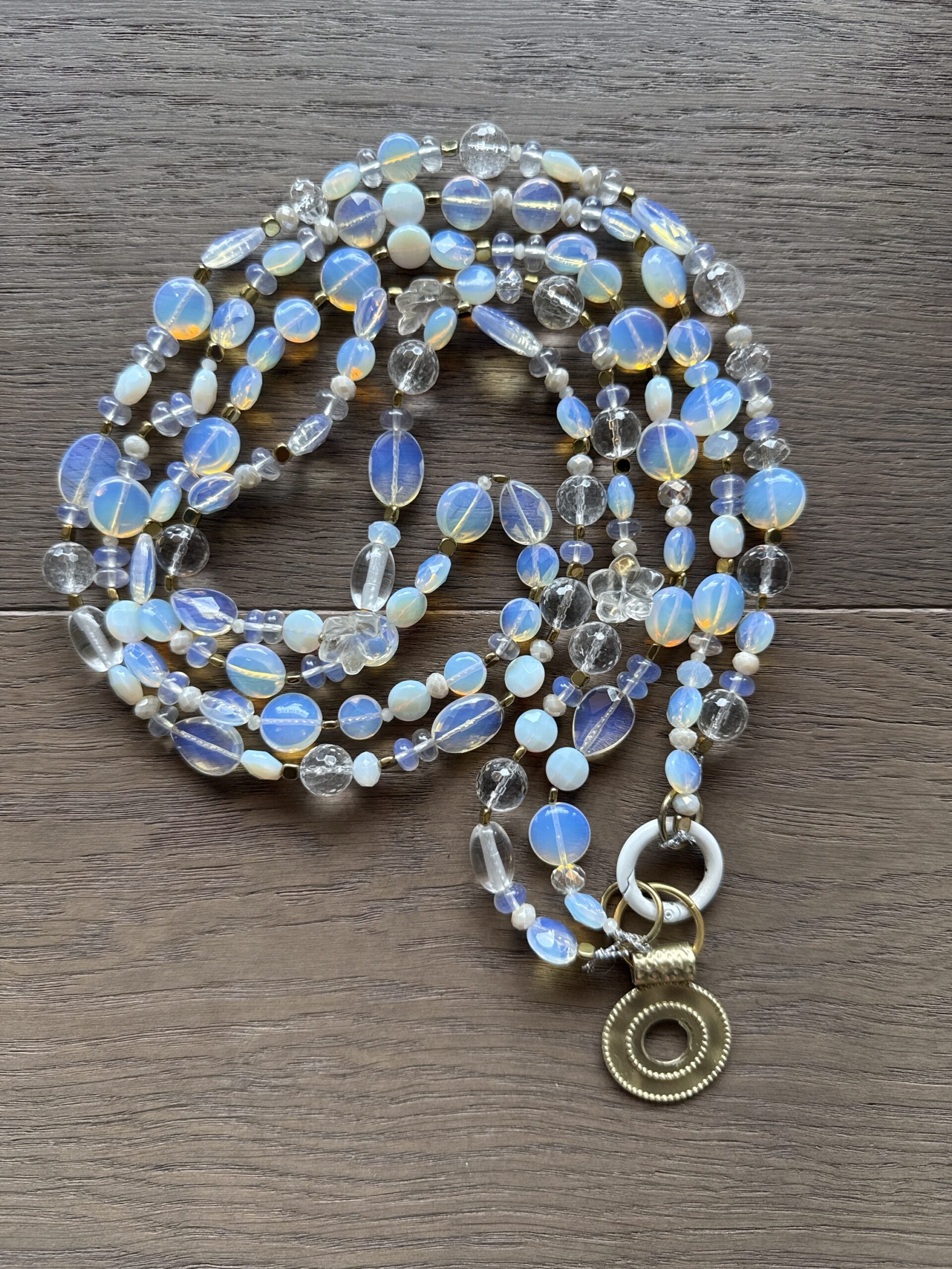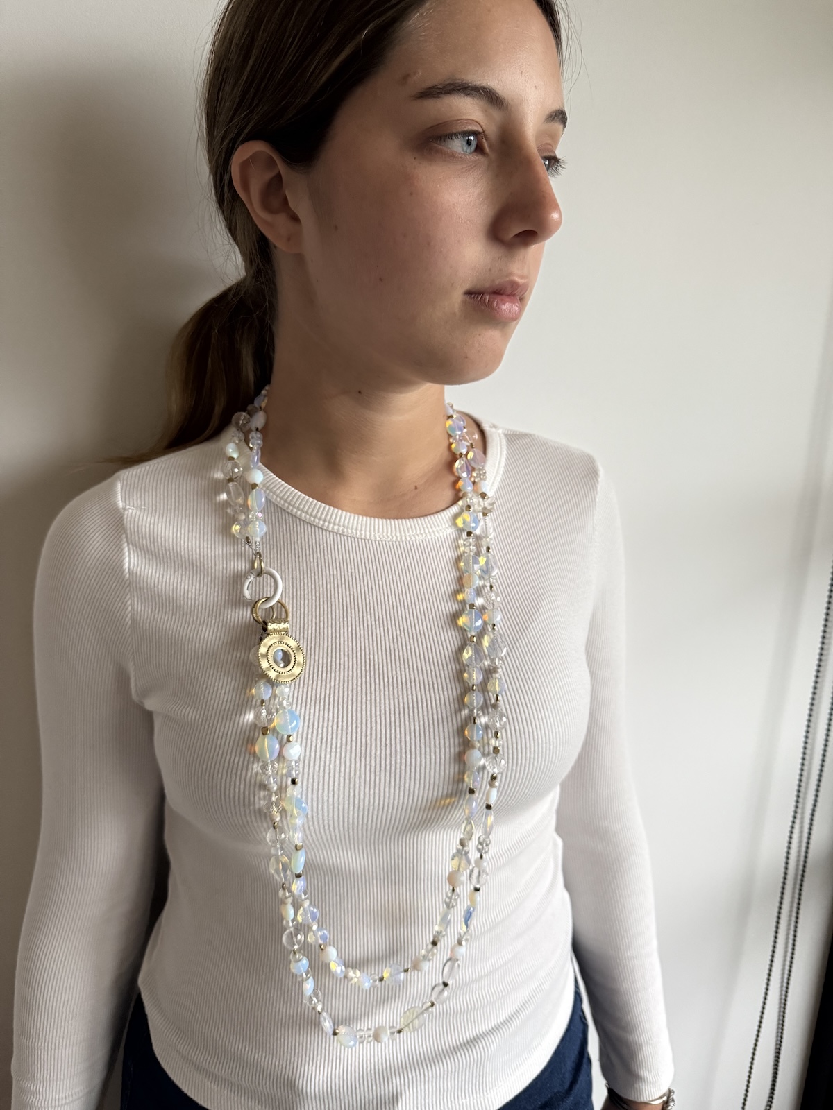 Collar largo con dos cuentas en tonos blancos y trasnparentes con sutil tornasol. Dije en tiono plata quemada y broche blanco