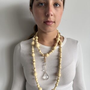Collar Best Seller. Caida de cuatro cadenas en diferentes alturas en tonos tornasolados. Detalle de lado de mariposas plateadas . Al cuello cuenta de cristales en tono lavanda pasados por hilo plateado.