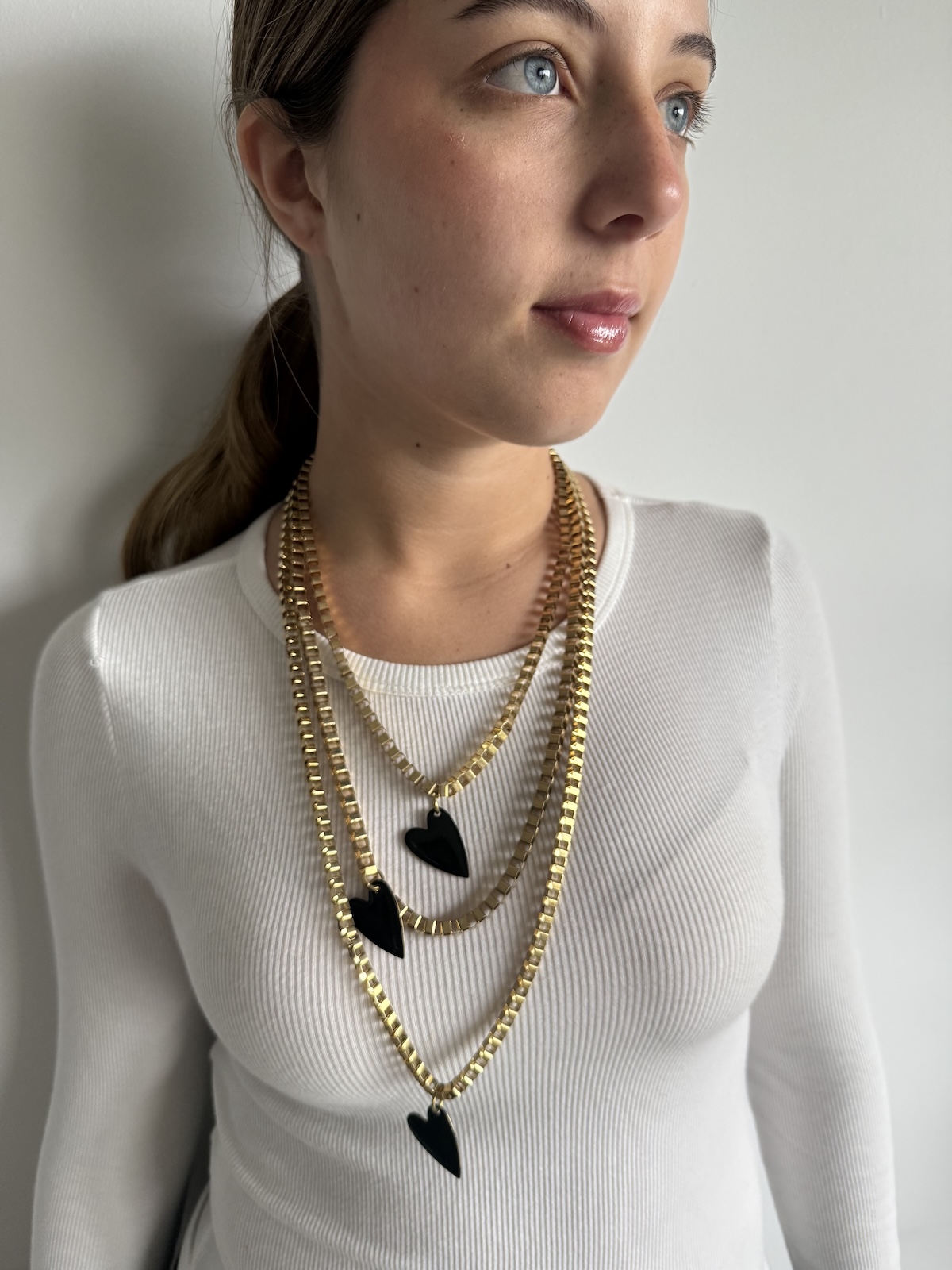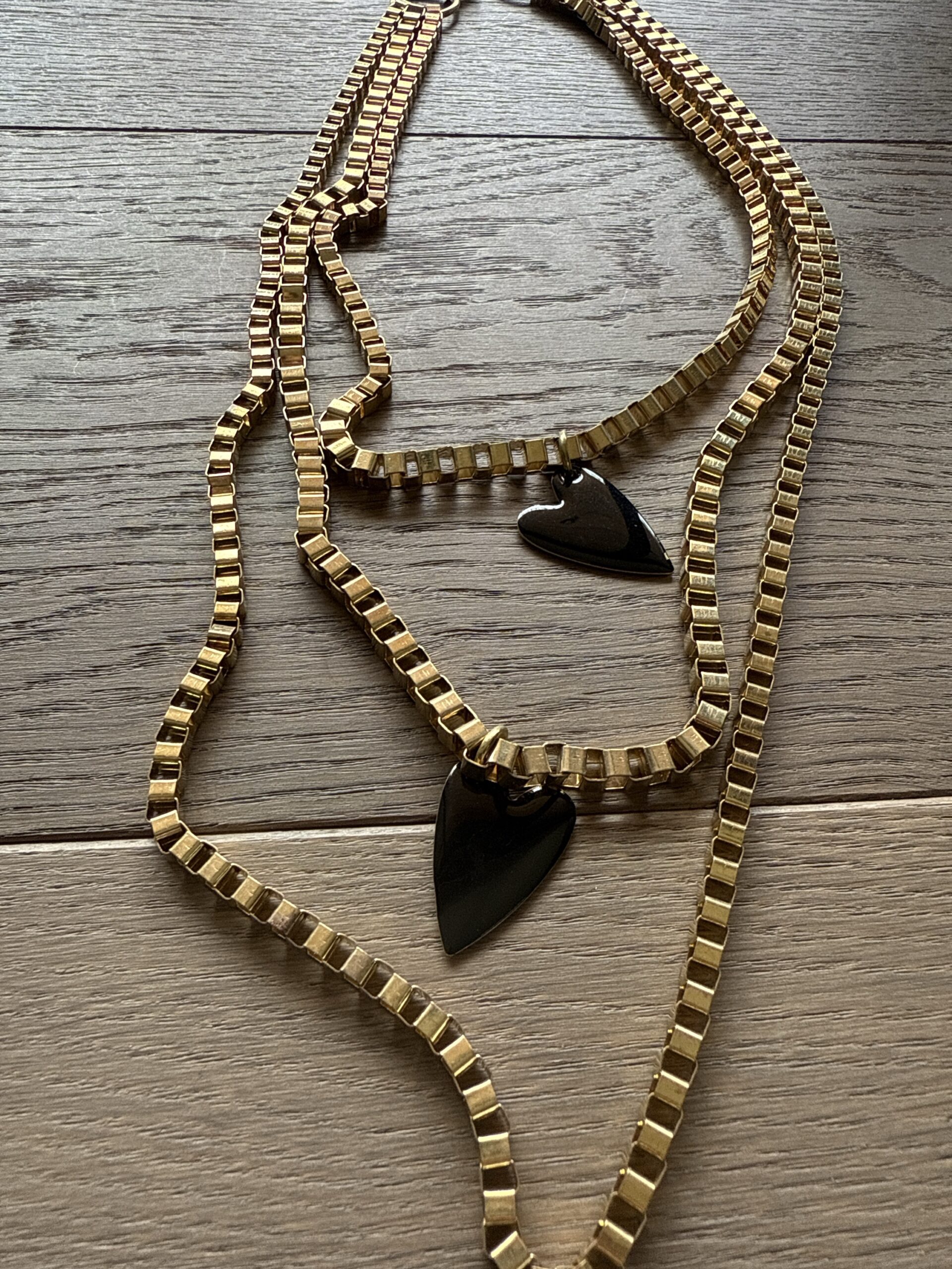 Collar de tres caida de cadena dorada de eslabones cuadrados. Cada cadena lleva colgado un dije en forma de corazon esmaltado color negro.