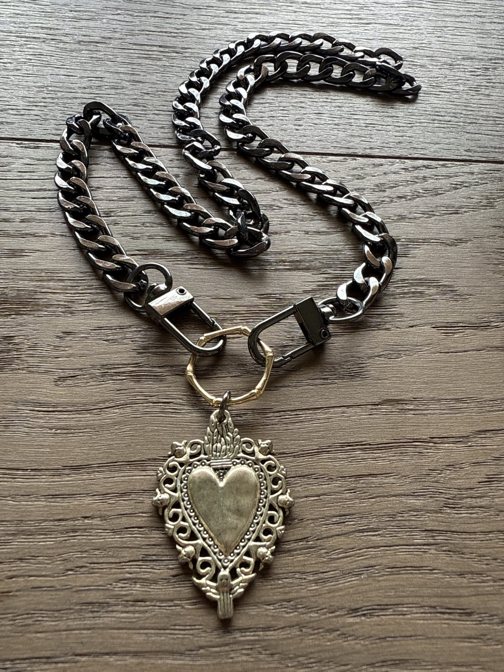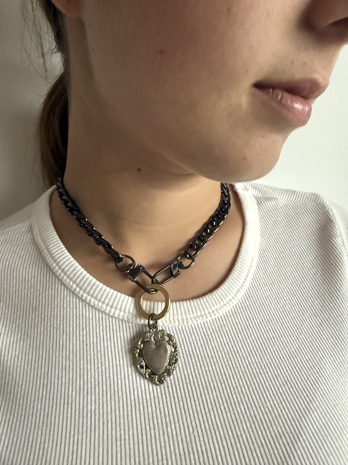 Collar corto de cadena de acerina. Detalle de corazon labrado plateado y broche en forma de aro color dorado.